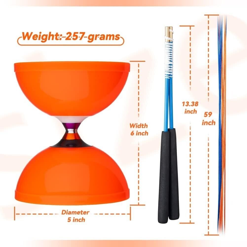 - Comfortable Grip – Diabolo comes with durable 13.38 inch carbon hand sticks, comfortable foam handles for superior grip, and 59 inches of string. The drawstring bag supplied with this set is big enough to store this diabolo set and many other juggling props as well. Weight: 257 grams. Diabolo diameter 5 inches. Diabolo width 6 inches