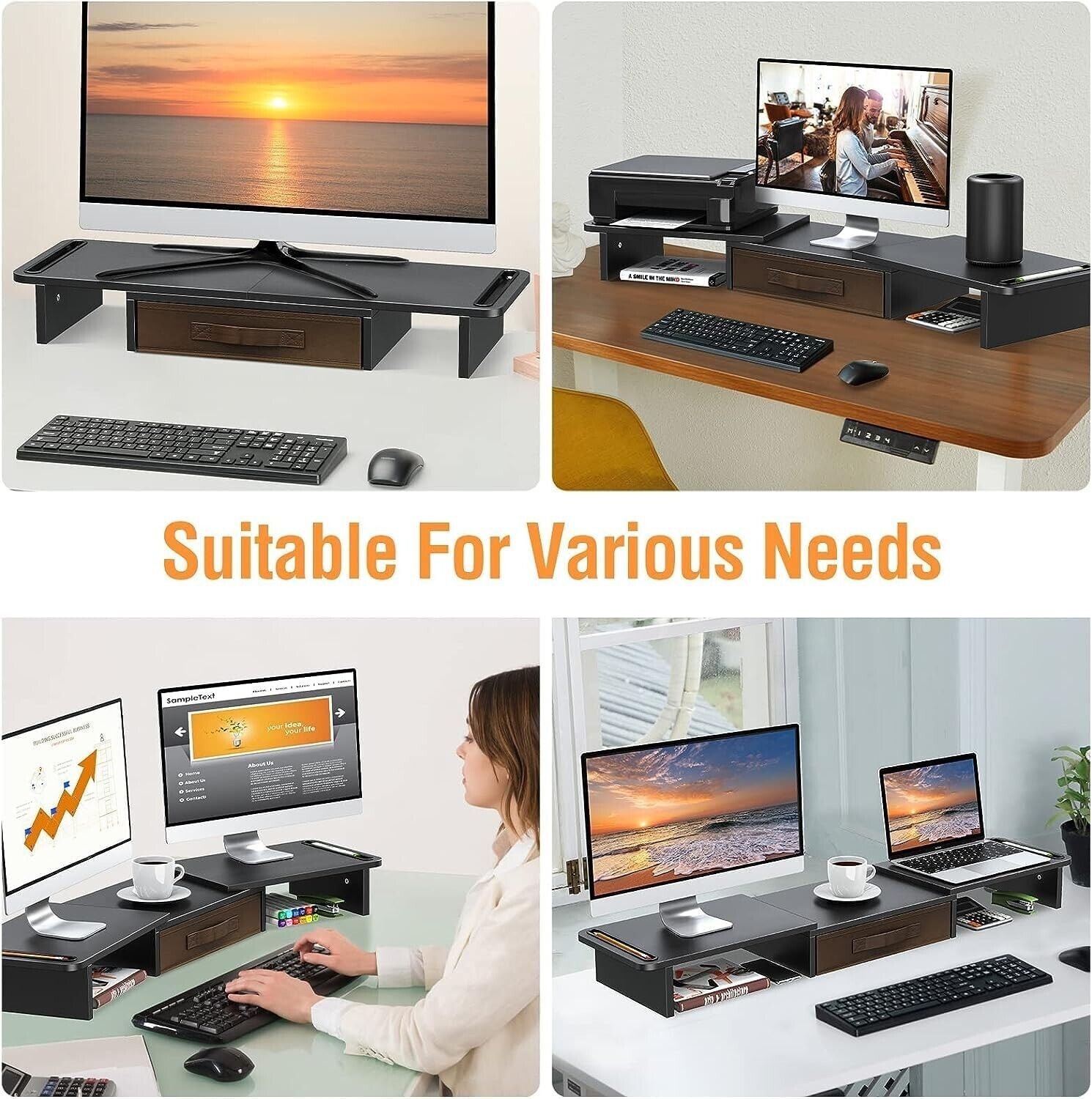 - Monitor Stand Riser for 2 Monitor Our Monitor Stand Riser is great for Desktop, Laptop Computer, iMAC, Printer. If you need multiple computers to work at the same time, you might as well choose our monitor stand riser. It can accommodate 2-3 monitors/laptops, meet your office needs.