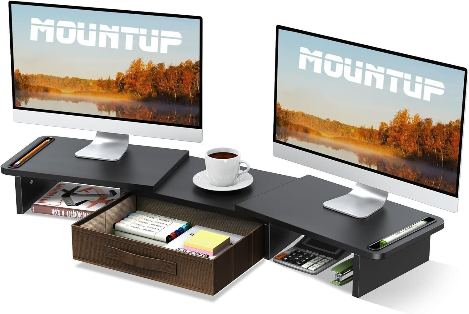 MOUNTUP Dual Monitor Stand Riser with Drawer-Adjustable Length and CC, Mon…