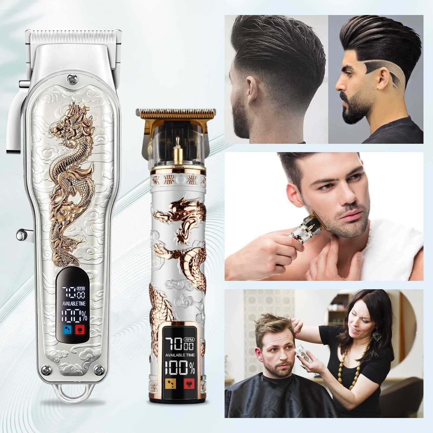 - Hair Clippers Kit for Barbers: Our professional barber combo includes: A cordless hair clipper equipped with 8 guide combs (3/6/10/13/16/19/22/25 mm), a t liners clippers for men equipped with 6 guides (1/2/3/4/5/6 mm), lubricating oil, cleaning brush, 2 USB charging cable, and a barber s comb.