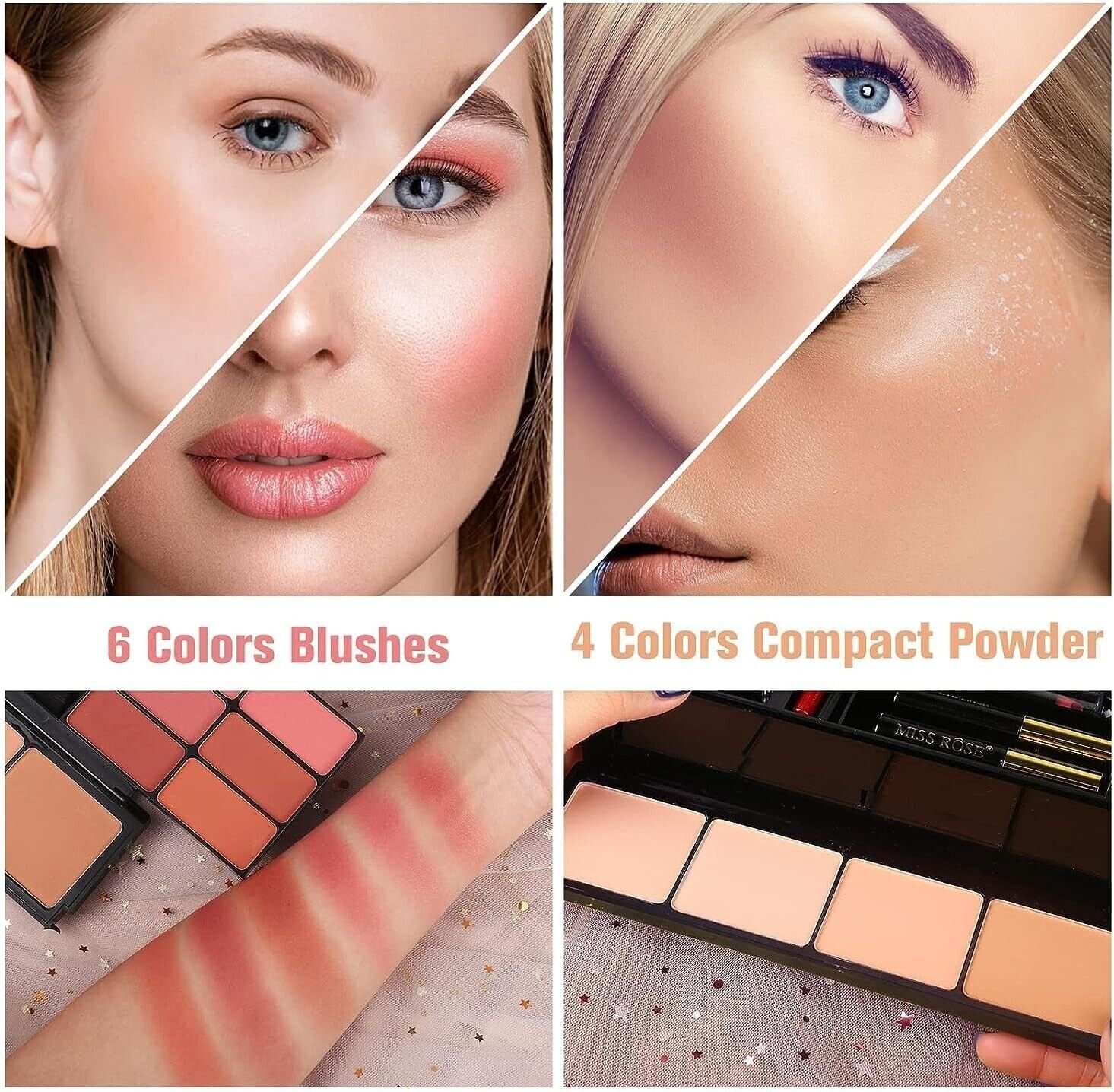 - All-in-One Makeup Kit Includes 39 colored eyeshadows, 6 Color Blush, 4 Color Comapct Powder, 3 Color Lipstick, 2 Color Pencil, 2 Color Glitter, 2 lip liners, 2 eyeliners, 4 eye shadow brushes , 1 mirror.
