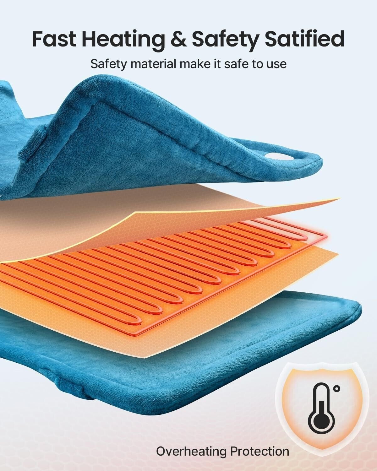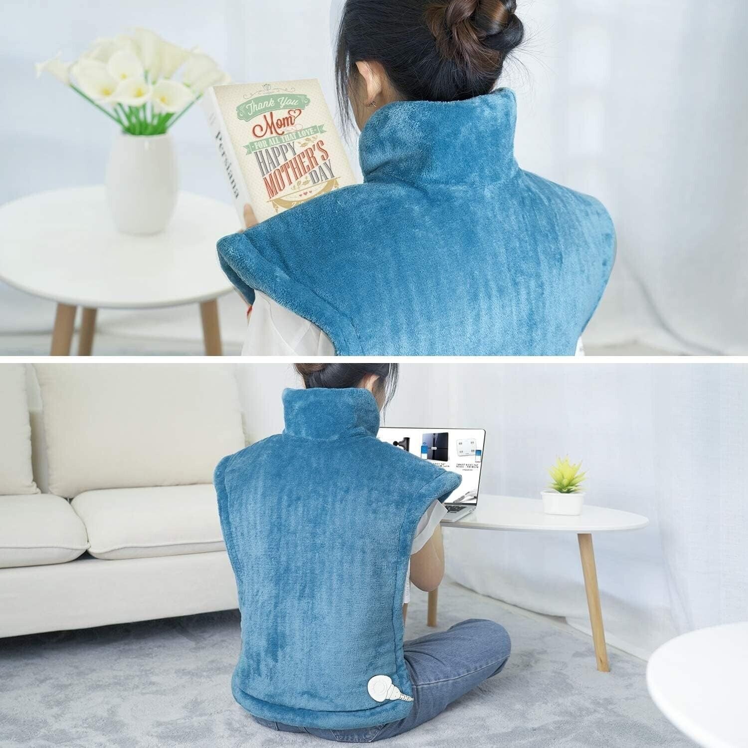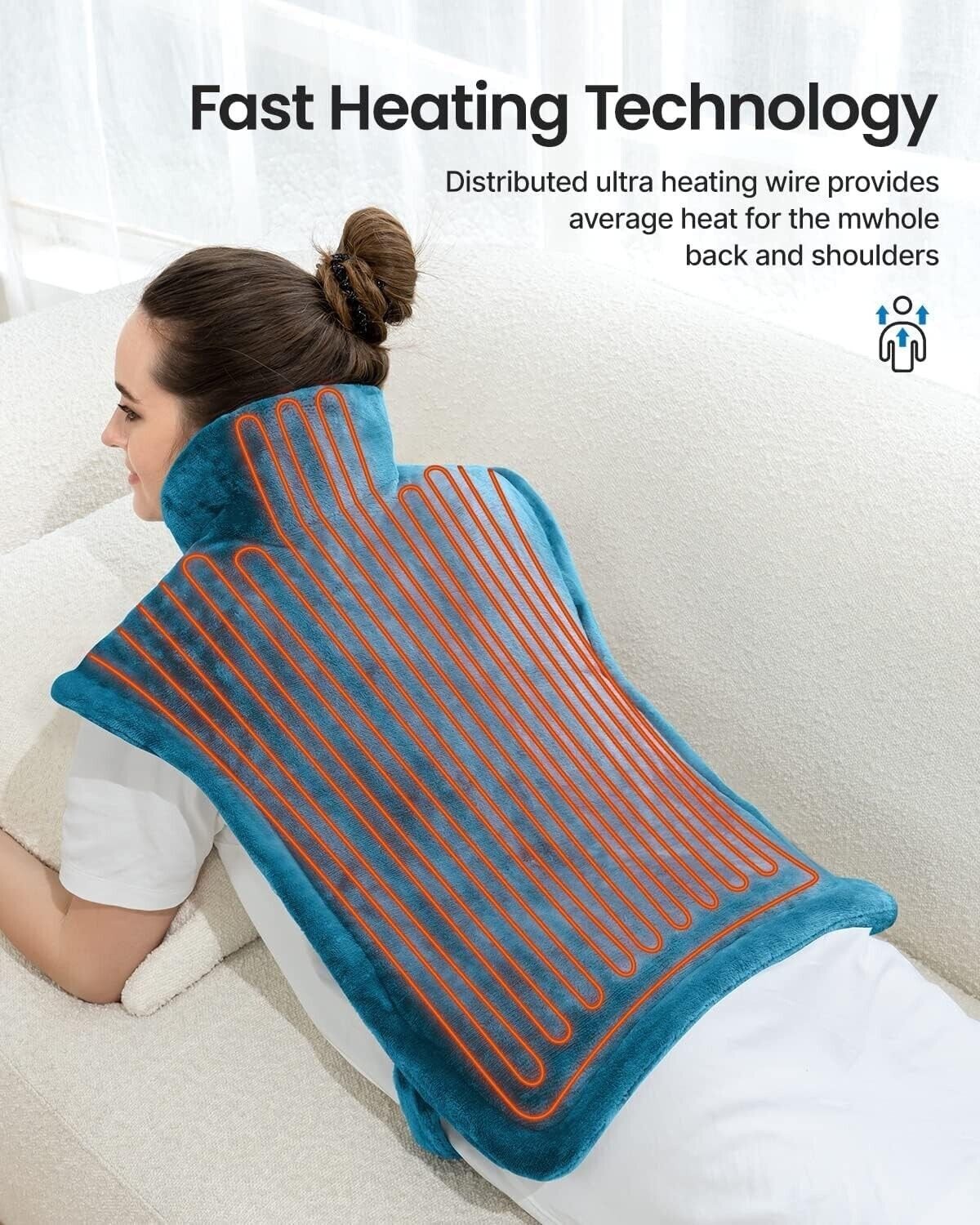 - Extra-large size for back: The extra-large 84x61cm heating pad offers full and snug coverage. Primarily designed for the shoulders and neck, the heating pad can also be flexibly applied to the back, waist, abdomen, legs, and more. Note: In order to get a better heating affection, please wear a piece of clothing inside, then put on the heating blanket. Finally, put on a coat or blanket to keep the temperature.