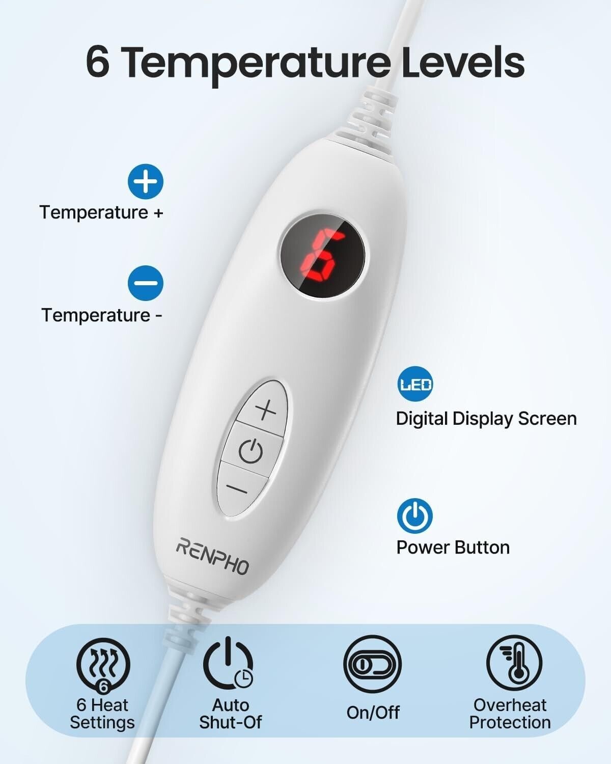 - Smart heating & timer settings: Led controller of the electric heating pad features 6 heat settings. The heating pad has 90 minutes timing settings. The auto-off timer ensures the safety and saves energy. The extra-long power cord allows you extra movement while using the heating pad.